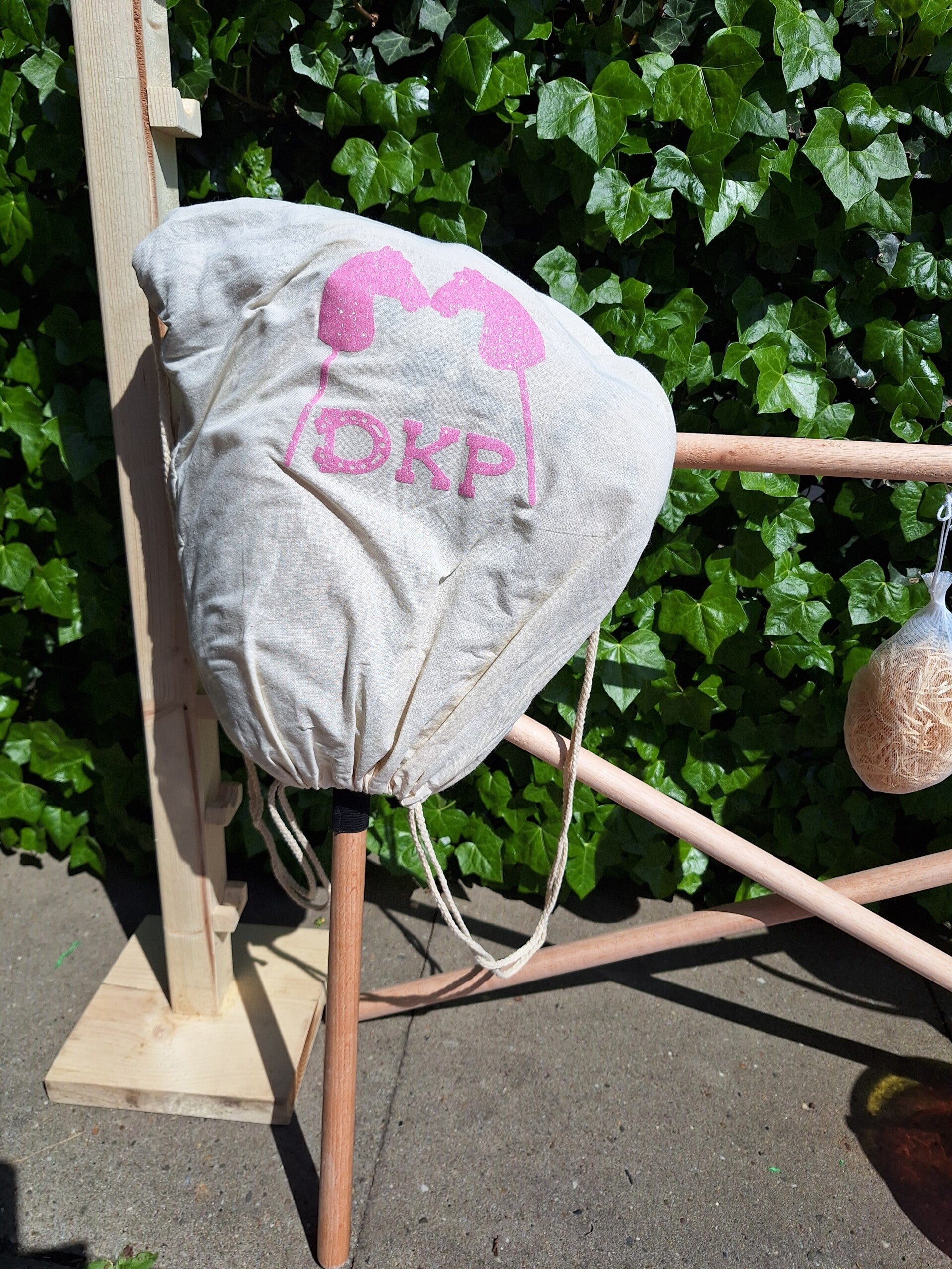 Hobby horse met DKP tas waar je je hobby horse in kan vervoeren en veilig houd voor viezigheid.