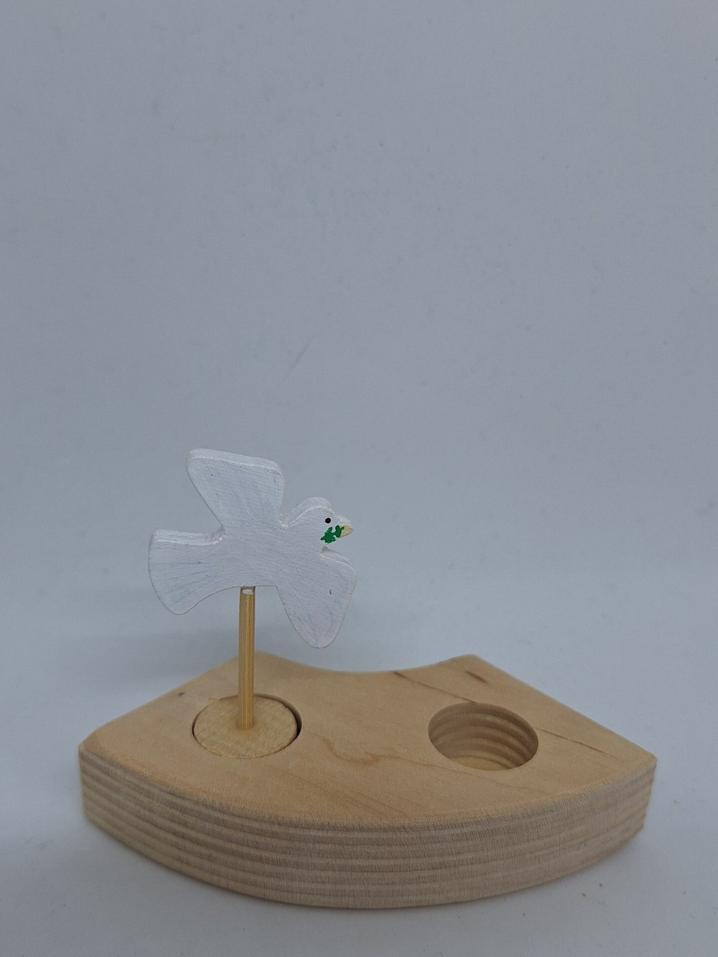 Witte duif op een stokje, aan een kant heeft de duif een groen takje in z'n snavel. De duif is mooi om tijdens 4 en 5 mei of pinksteren in de jaarring te zetten.