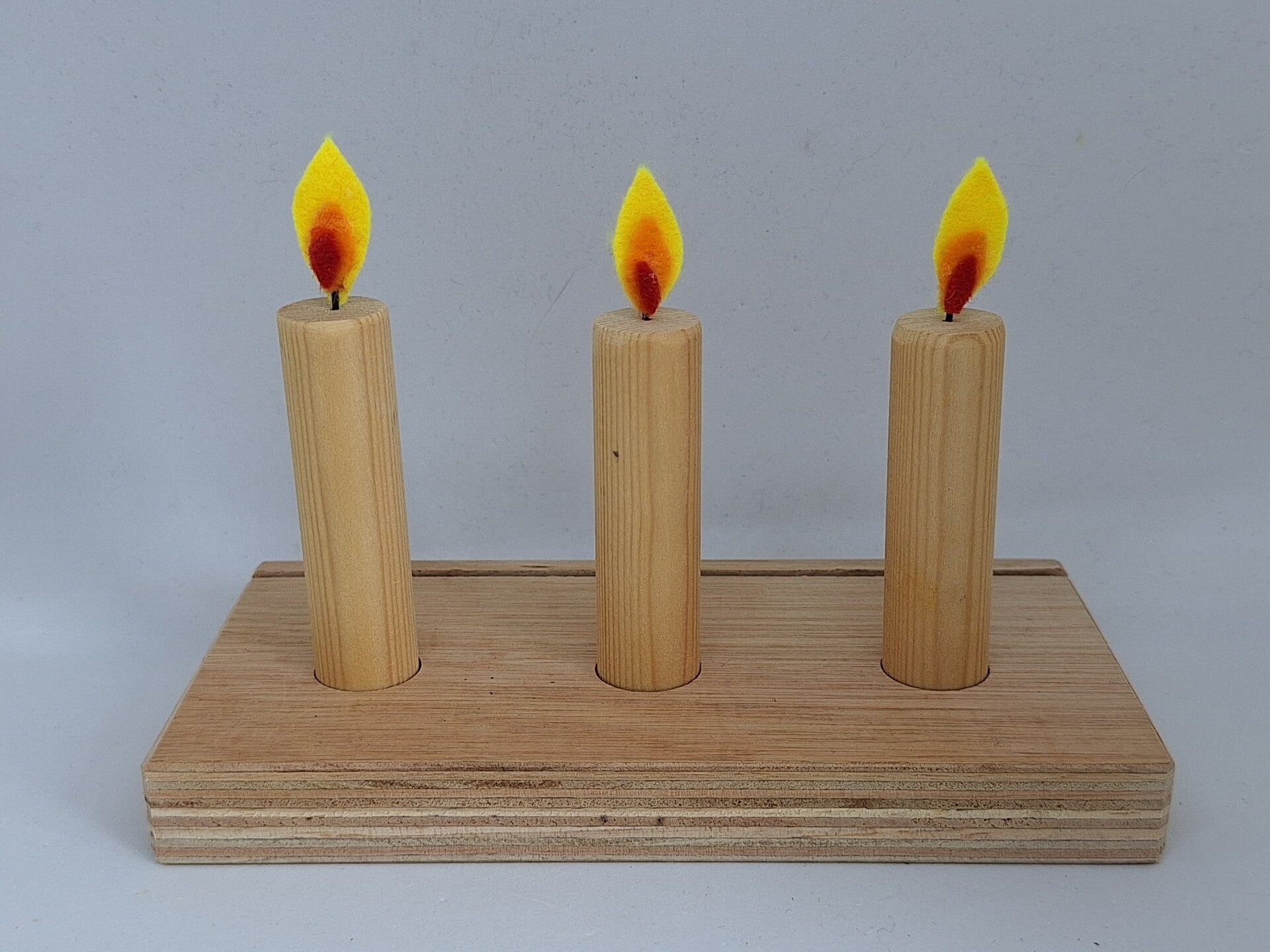 Houten kaars met vilten vlam, een veilig alternatief voor echte kaarsen in de jaarring. De kaars is onbehandeld en kan dus nog versierd worden met o.a. verf, potlood of bijenwas.