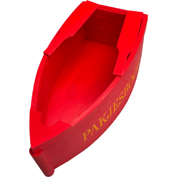 Het stevige houten bootje is voorzien van decoratieve details, zoals rode roeispanen en het opschrift Pakjesboot.
